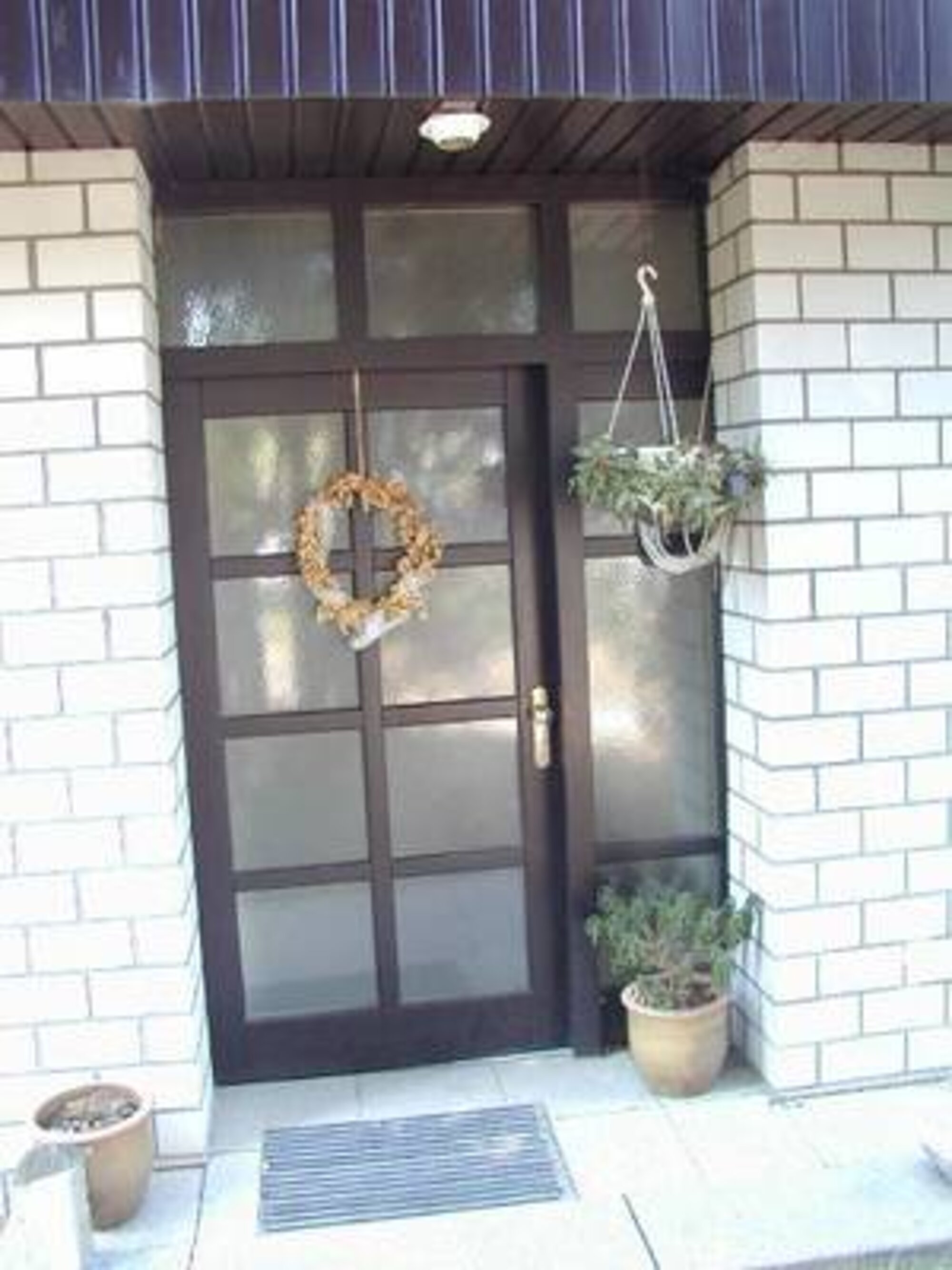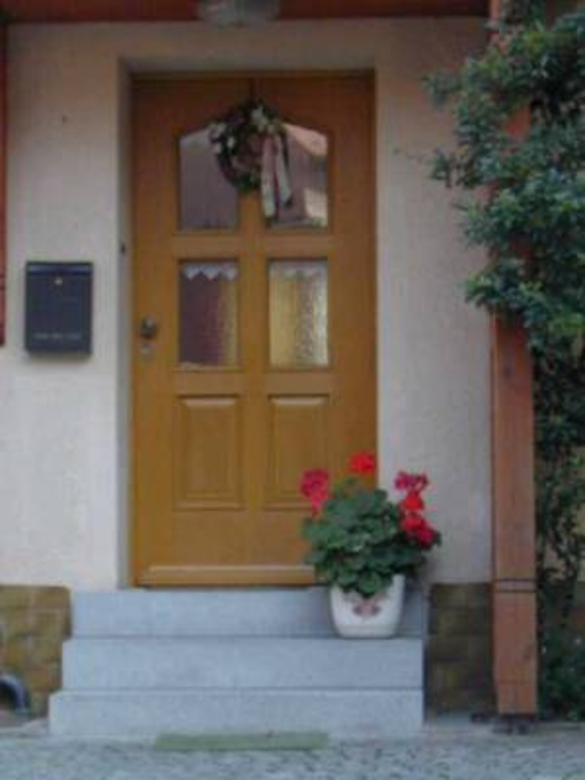 Haustür mit zwei massiven Füllungen unten, darüber Füllungen mit Ornament-Isoglas