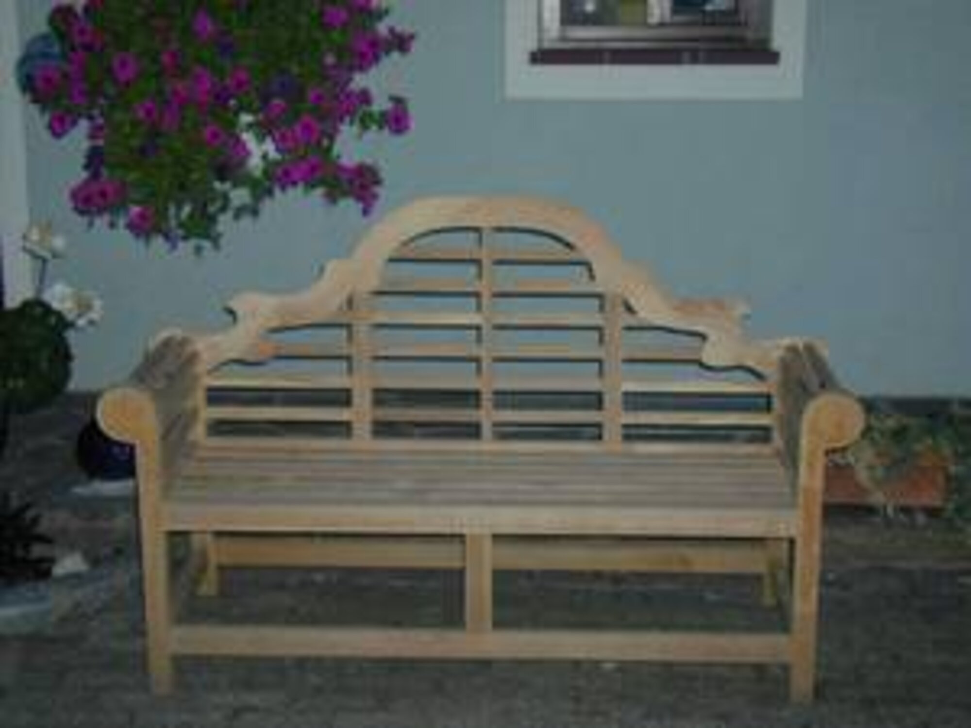 Massive Gartenbank mit elegant geschwungenen Seitenteilen