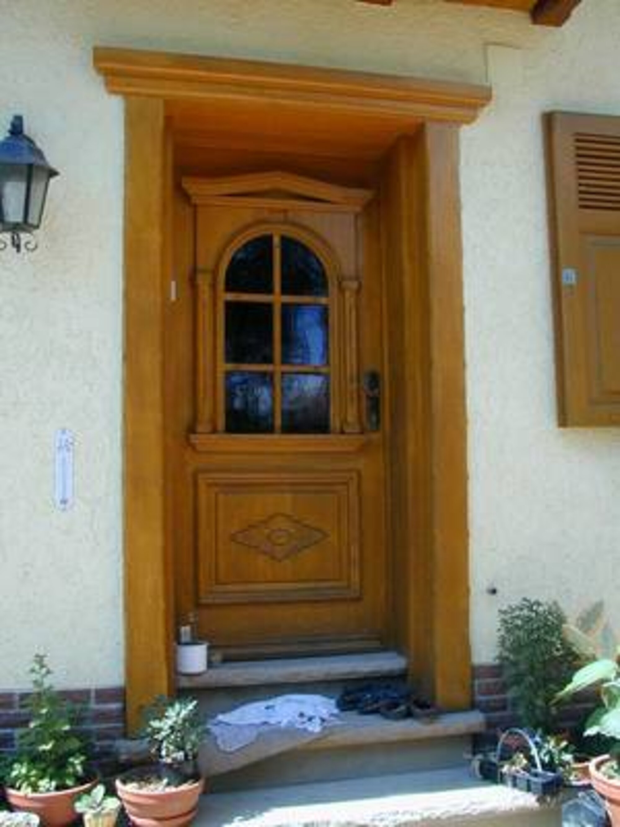 Eingangstür mit Rundbogen, mit Dickschichtlasur endbehandelt, Hewi-Griff
