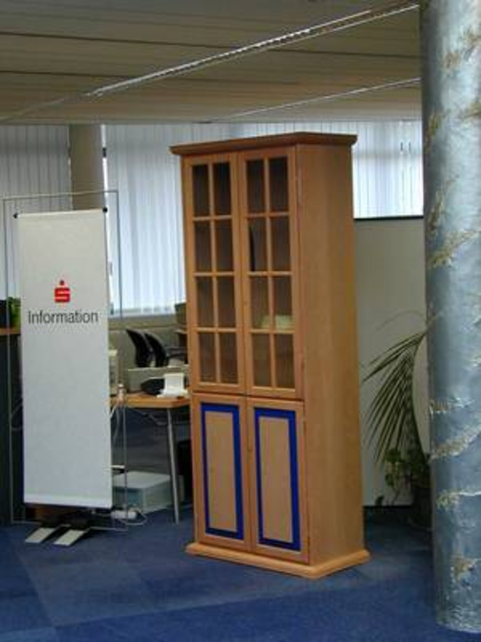 Bücherregal aus MdF, weiß lackiert, Türen mit aufgesetzten Leisten, Kranz mit Halogen- lampen